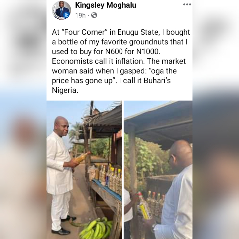 “At “Four Corner” in Enugu State, I bought a bottle of my favorite groundnuts that I used to buy for N600 for N1000. Economists call it inflation. The market woman said when I gasped: “oga the price has gone up”. I call it Buhari’s Nigeria.”