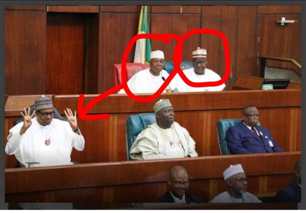 President Buahri Inlaw Ahmed Indimi Has react to the look of senate president Saraki and Dogara look at the President at the senate house during Budget presentation.
