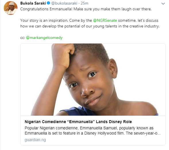 Comediene Emmanuella landed a disney role and the Nigerian senate president, Bukola Saraki deemed it fit to congratulate the young and famous comedienne.