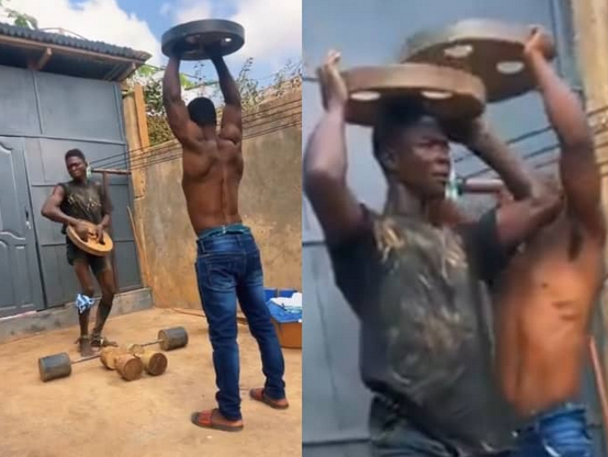 In the video, the bodybuilder is seen lifting weights before handing some over to the intruder.