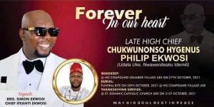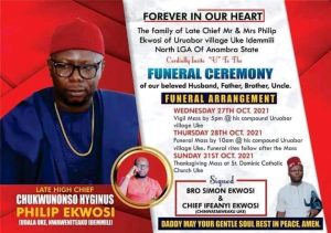 He will be buried in his country home, Uruabor Village Uke, Idemili North Local Government Area of Anambra State, on the 28th October 2021.