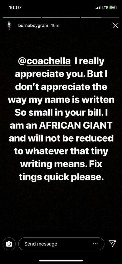 However, Burna Boy was not happy about the way that the festival organisers wrote his name on their promotional material and he took to Instagram to make his thoughts known.