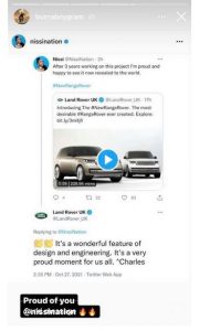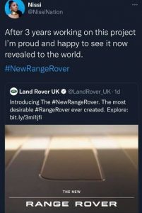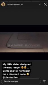 Grammy Award winner, Burna Boy took to social media to celebrate his sister, Nissi, who was part of the team that designed the 2022 Range Rover.