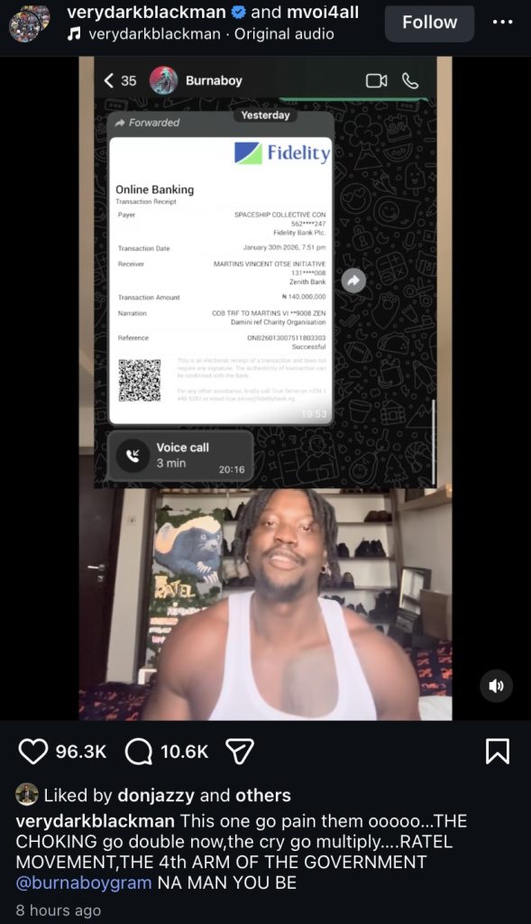 Afrobeats star Burna Boy has donated N140 million to the non-governmental organisation (NGO) run by controversial social media critic VeryDarkMan (VDM), making him the highest single donor to the initiative so far.