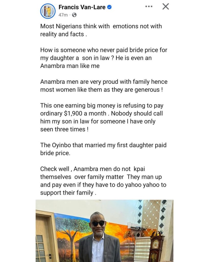 In a post shared on his social media account, Van-Lare dismissed claims of Dr. Erinne being his son-in-law, citing the fact that Erinne never paid a bride price for his daughter. He questioned how anyone could consider Erinne a son-in-law and criticized his refusal to provide financial support of $1,900 monthly for his children. Van-Lare stated, “Most Nigerians think with emotions, not with reality and facts. How is someone who never paid bride price for my daughter a son-in-law?”