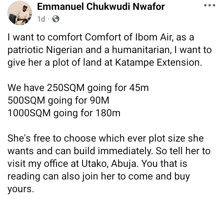 “I want to comfort Comfort of Ibom Air, as a patriotic Nigerian and a humanitarian, I want to give her a plot of land at Katampe Extension.