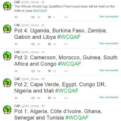 Today, Confederation of African Football (CAF) released the official country rankings for the upcoming FIFA World Cup qualifiers. Nigeria has been placed in pot 2 with Egypt, Cape Verde, Congo DR, and Mali. The official draw for the Russia 2018 World cup qualifiers will take place on the24th of June.