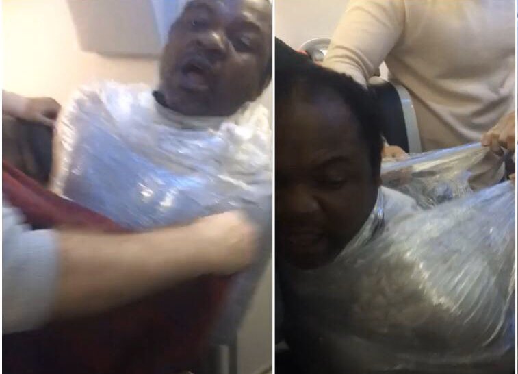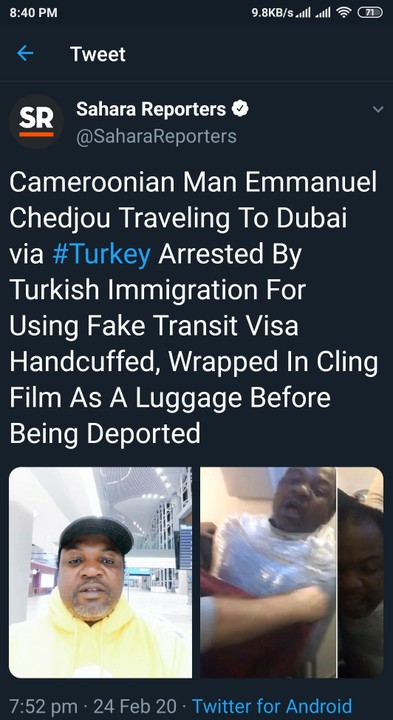 Cameroonian Man Emmanuel Chedjou Traveling To Dubai via #Turkey Arrested By Turkish Immigration For Using Fake Transit Visa Handcuffed, Wrapped In Cling Film As A Luggage Before Being Deported.