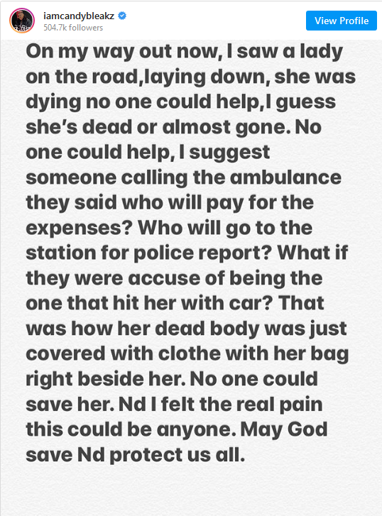 Taking to her Instagram page, she shared narrayed the story of how she saw an accidnet victim who was ;eft to die on the road because people were too scared to help her. She wrote: “On my way out now, I saw a lady on the road, laying down, she was dying one one could help., I guess shes dead or almost gone. No one could help, I suggest someone calling the ambulance they said who will pay for the expenses? Who will go to the station for report?