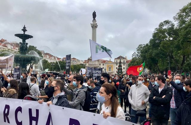 protested in Lisbon on Saturday as a partial weekend lockdown kicked in across most of the country.