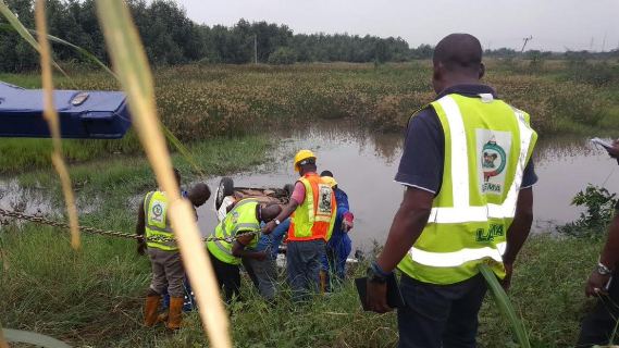 This white car crashed into a canal at Magidun in Ikorodu, Lagos state this morning. Men of the Lagos state Emergency Management Agency, LASEMA, pictured at the scene of the accident.