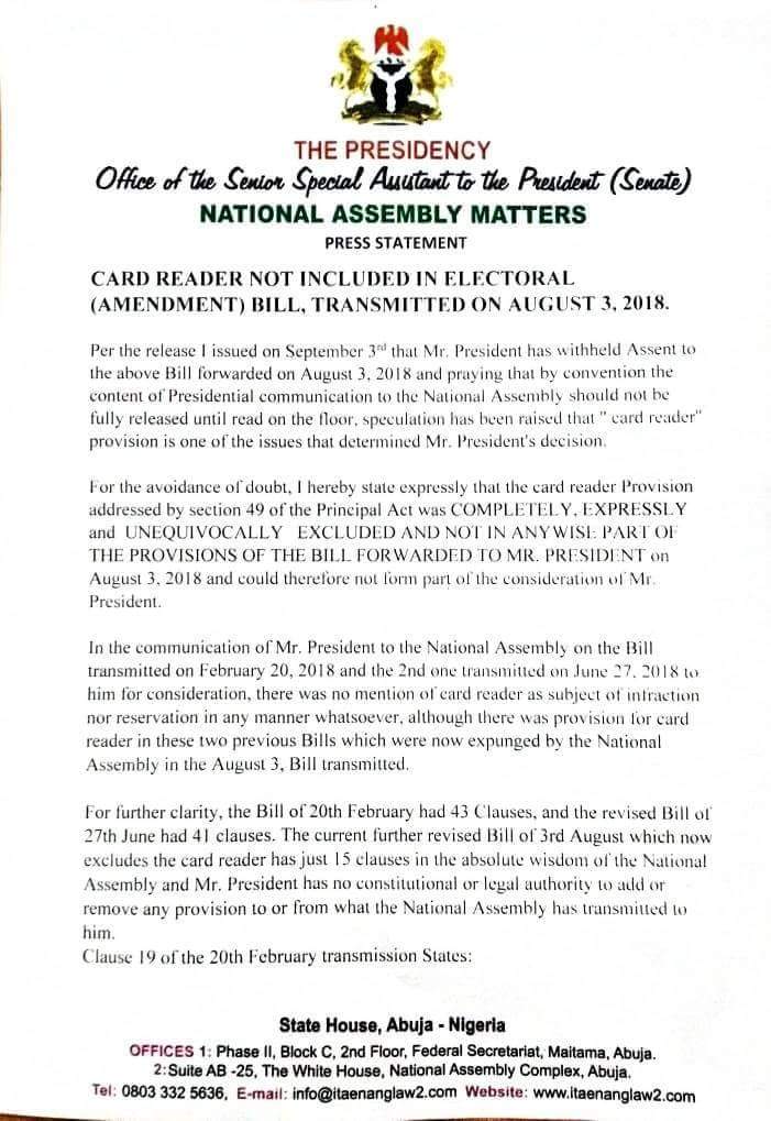 Card Reader Not Included In Electoral Amendment Bill Sent To The President - 9jaflaver