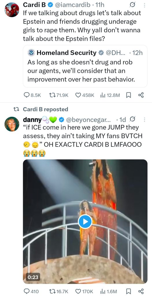 Cardi B replied on X, referring to the Justice Department’s gradual release of files from the investigation into the accused sex trafficker Jeffrey Epstein since December: “If we talking about drugs, let’s talk about Epstein and friends drugging underage girls to r@pe them. Why y’all don’t wanna talk about the Epstein files?”