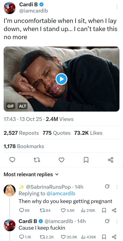 The rapper, who is expecting her fourth child, took to X to write: “I’m uncomfortable when I sit, when I lay down, when I stand up… I can’t take this no more.”