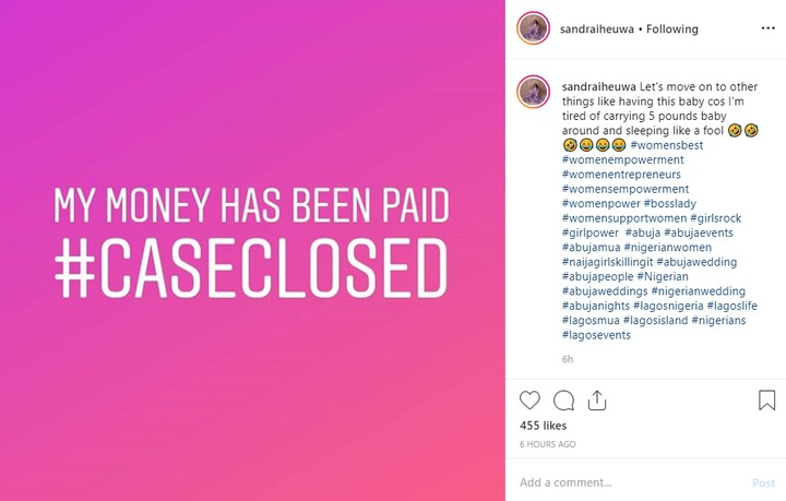 Triple MG boss, Ubi Franklin’s soon-to-be 4th baby mama, Sandra Iheuwa, has announced that she’s finally been paid her money.