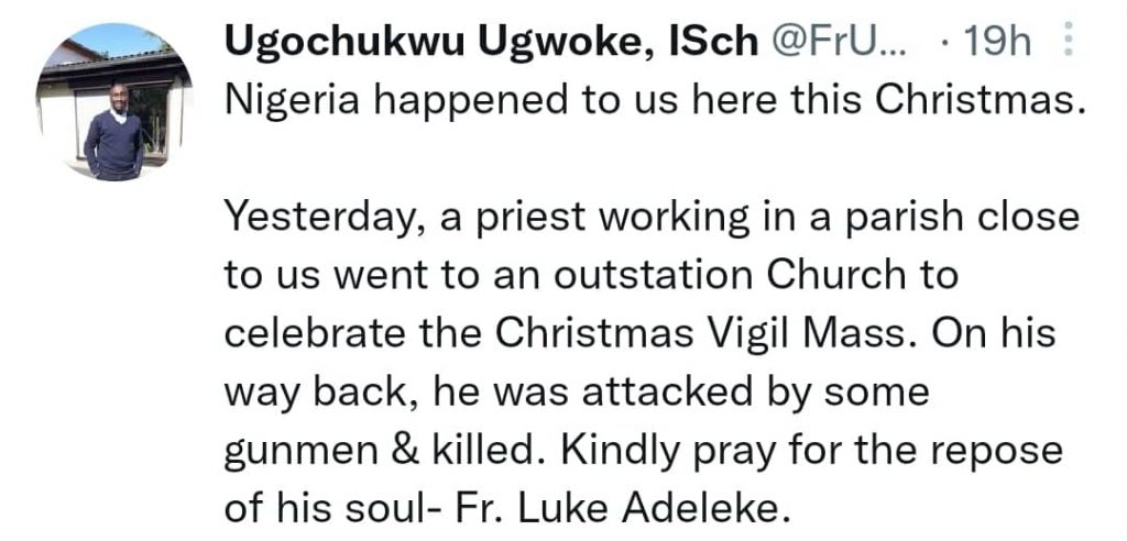 A young Catholic Priest, Rev Fr Luke Adeleke of Abeokuta Diocese was murdered in abeokuta Yesterday evening on his way home after Mass. he was attacked by some Gun Men and shot Dead. May God rest his soul. Amen.Woe to these Evil Men.