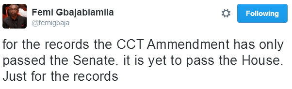 Majority leader of the House of Representatives, Femi Gbajabiamila, took to his twitter handle, to react to last week’s announcement by the senate that it has amended the CCT act. Gbajabiamila in his tweet said for the records, the amendment was only carried out in the senate and not the House of Representatives.