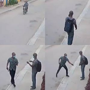 In the video, the man could be seen walking along the lonely road while using his phone. He was stopped by two men who were riding on a motorcycle.