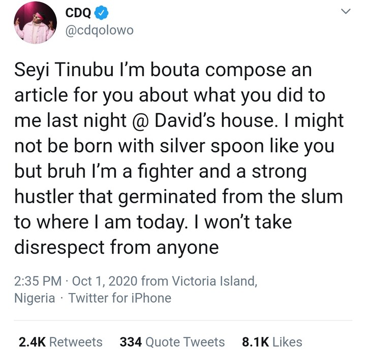 CDQ expressed his feelings in a Twitter post on Thursday saying, “Seyi Tinubu I’m bouta compose an article for you about what you did to me last night @ David’s house.