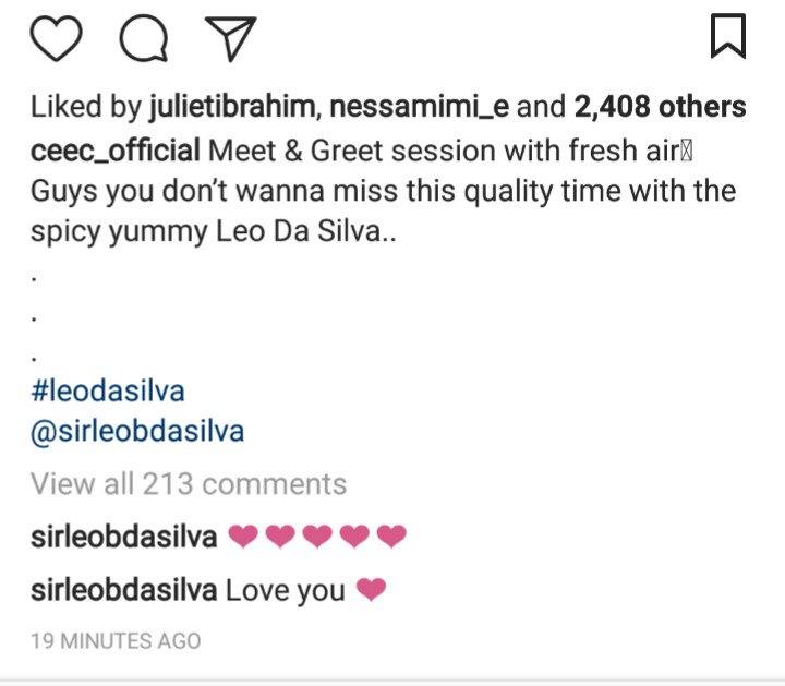 Former Big Brother Naija housemate, Cee-C just called fellow ex-housemate, Leo “Fresh air” in a new Instagram post for his meet and greet.