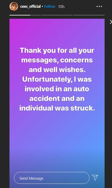 Nigerian reality star, Cynthia Nwadora popularly known as Cee-C has broken her silence following a near-fatal accident with her car yesterday in Enugu.