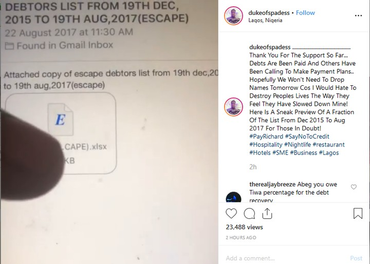 In a post he just made over his Instagram page, the socialite wrote that he wouldnt love to destroy the debtor’s careers, even though they didn’t have that in mind while they refused to pay money being owed to him.