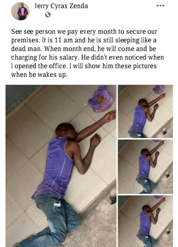 Man identified as Jerry Zenda has through his media handle call out his security guard for sleeping at length during morning hours after working all night.
