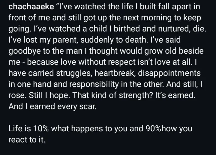 Her post reads,“I’ve watched the life I built fall apart Infront of me and still got up the next morning to keep going. I’ve lost my parents suddenly to death, I’ve said goodbye to the man I thought would grow old beside me.Life is 10% what happens to you and 90% how you react to it”.