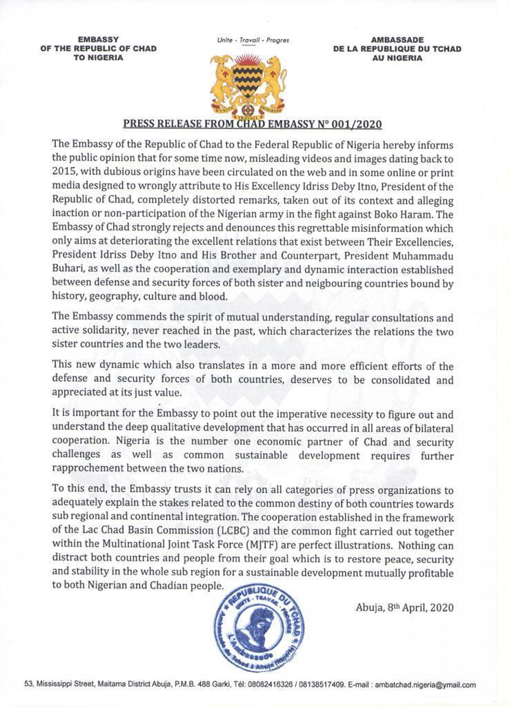 Chad Embassy Writes Nigeria On Chadian Military Videos In Circulation