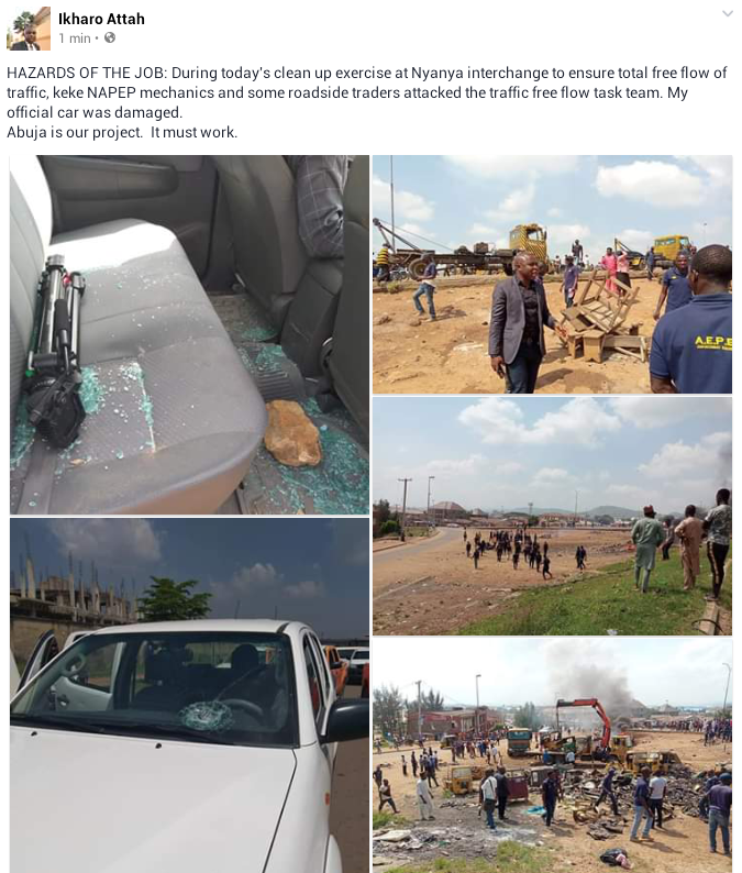 The Chairman, Federal Capital Territory (FCT) Ministerial Task Team on traffic-free flow in Abuja, Mr Ikharo Attah, was attacked by Keke mechanics and roadside traders, at a Keke Napep park in Nyanya when his team went to raid illegal stores and shanties in the area.