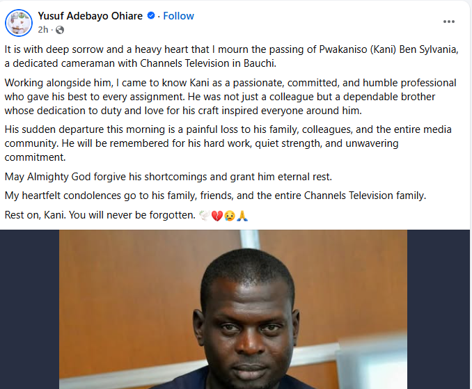 A cameraman with Channels Television, Kani Ben, has d!ed from spinal cord injuries he sustained in a ghastly road accident in Bauchi State.