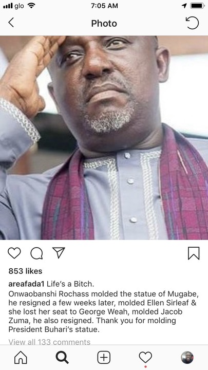 The veteran singer backed his claim with how most African leaders turned out after the Imo governor built a statue in their honor. Stating that the ‘Rochas Okorocha curse’ will befall Buhari, Charly Boy wrote: