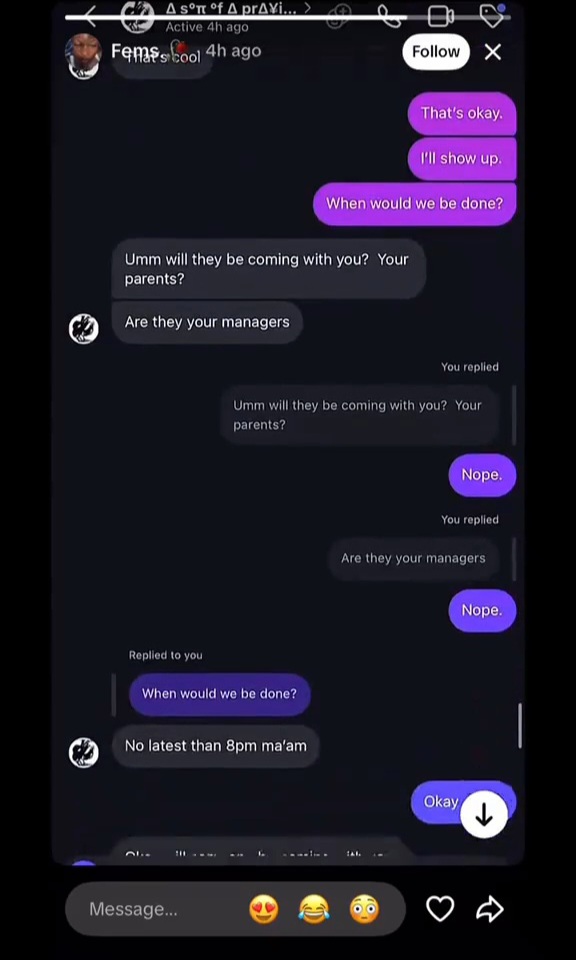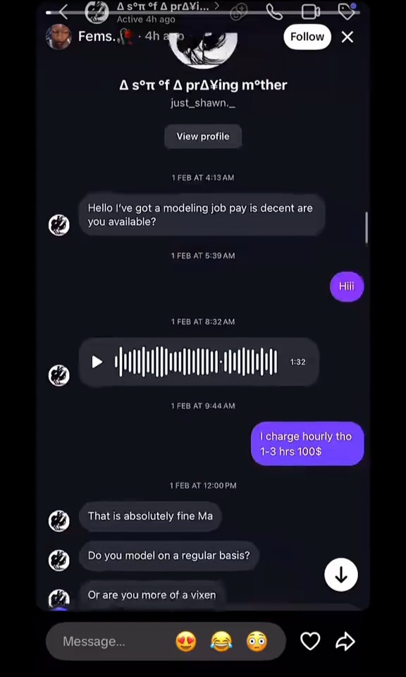 In the chat, the man, who goes by “The Son of a Praying Mother,” is seen speaking to her about a job, asking for her fee and other requirements, and vowing that he can’t cheat her.