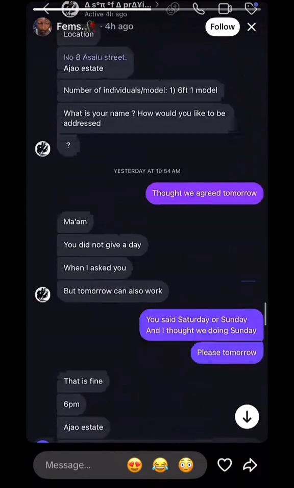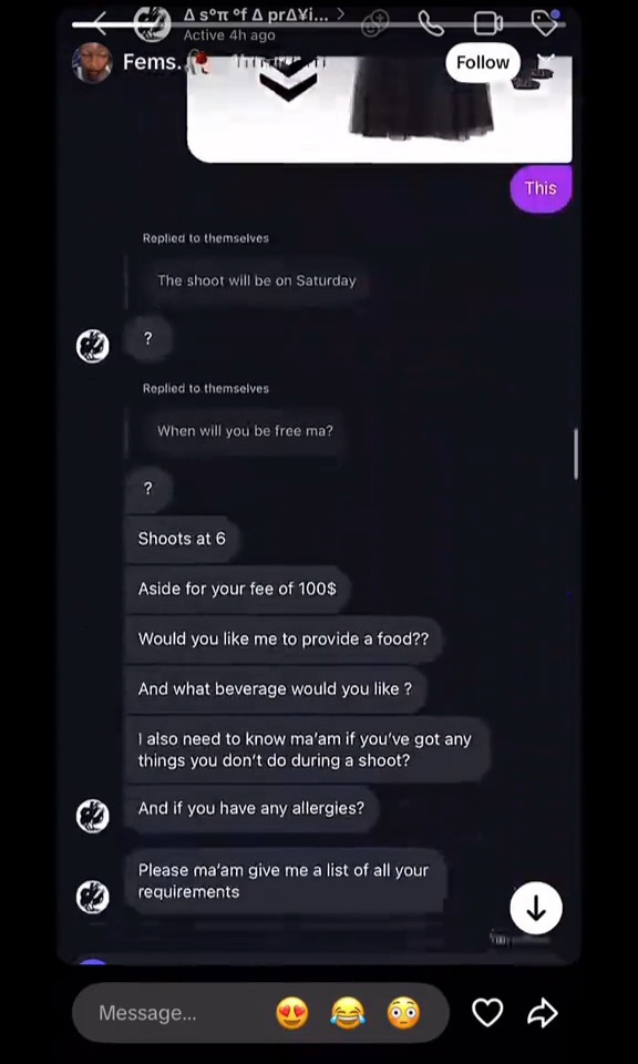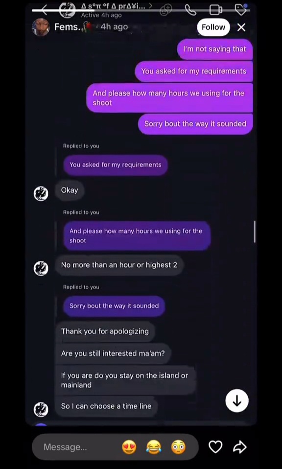 The man sounded professional in the chat, up until when the lady expressed concern about the time he chose for the shoot.