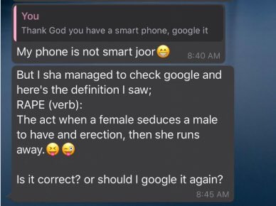 A Twitter user has shared screenshots of her chat with a medical doctor. The screenshots show him joking about rape and blaming it on the way women dress.