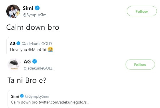 Newly weds, Adekunle Gold and Simi, had this cheeky conversation on twitter yesterday after a Manchester United match.