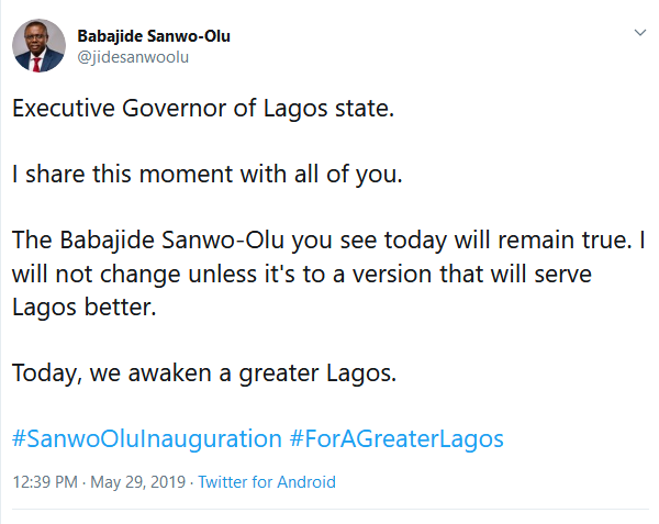Executive Governor of Lagos state. I share this moment with all of you. The Babajide Sanwo-Olu you see today will remain true. I will not change unless it’s to a version that will serve Lagos better. Today, we awaken a greater Lagos. #SanwoOluInauguration #ForAGreaterLagos