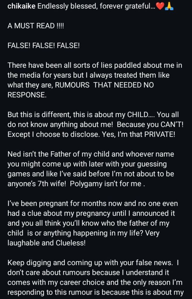 In her latest Instagram post, the actress clarified that Ned Nwoko is not the father of her child, stating she is not open to polygamy.