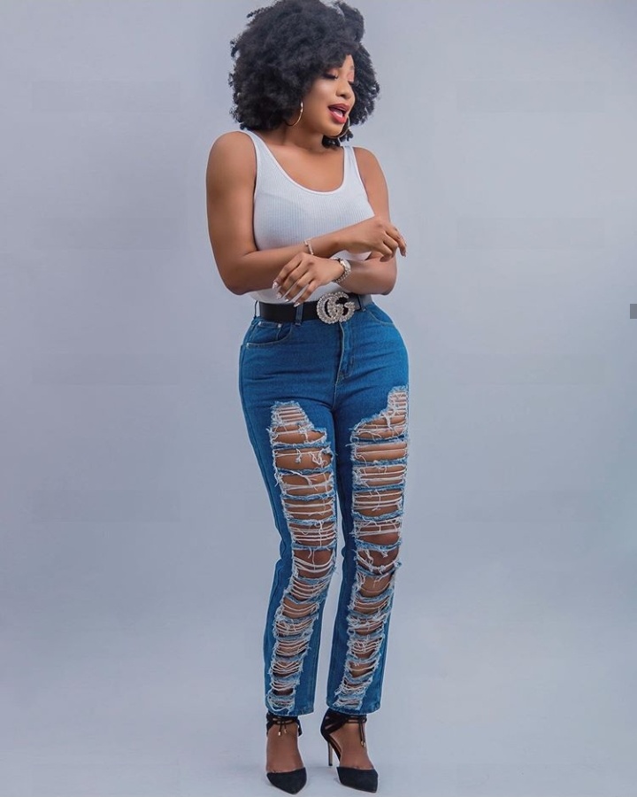 Actress Chika Ike shares chic adorable photos where she rocked chic denim trouser with crazy effects, complimented with white chic top…She paired with a black designer belt and a pair of heeled shoes posing in styles.