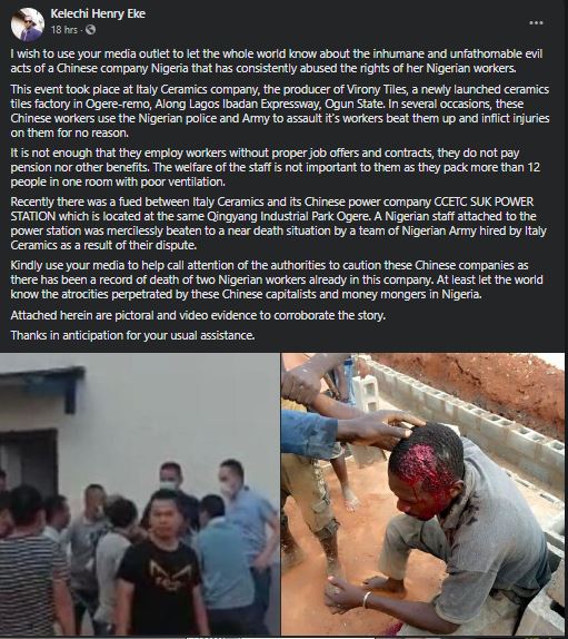 A Nigerian staff attached to the power station was mercilessly beaten to a near death situation by a team of Nigerian Army hired by Italy Ceramics as a result of their dispute.Kindly use your media to help call attention of the authorities to caution these Chinese companies as there has been a record of death of two Nigerian workers already in this company.