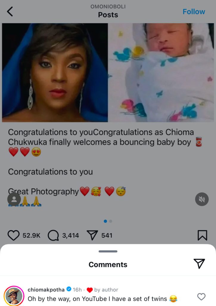 Reacting to the rumors of welcoming a baby boy, Chioma Akpotha took to the comment section of Omoni and sarcastically replied, “Oh by the way, on YouTube I have a set of twins 😂.”
