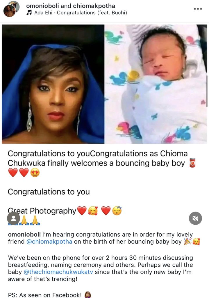 “I’m hearing congratulations are in order for my lovely friend @chiomakpotha on the birth of her bouncing baby boy 🎉🥰 We’ve been on the phone for over 2 hours 30 minutes discussing breastfeeding, naming ceremony and others. Perhaps we call the baby @thechiomachukwukatv since that’s the only new baby I’m aware of that’s trending! PS: As seen on Facebook! 🤦🏽‍♀️”