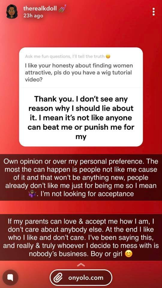Kiku went further to reveal that her parents know about her sexuality and have also accepted her the way she is. She added that the least people can do is hate her even though whoever she decides to “mess with” both boy or girl, is nobody’s business.