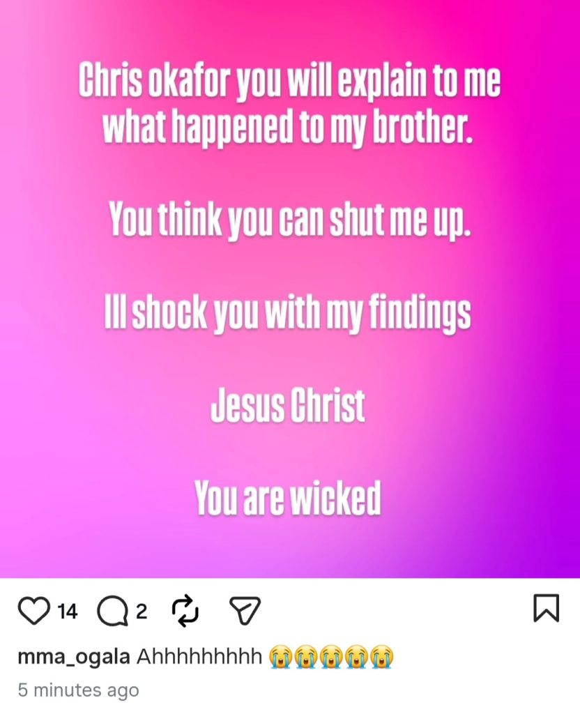 In a new post on Instagram, Doris wrote: “Chris Okafor you will explain to me what happened to my brother.
