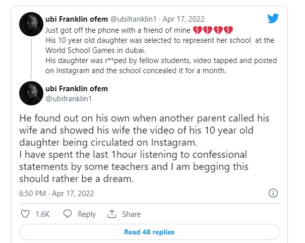 A Nigerian music executive, Ubi Franklin took to Twitter on Sunday evening to narrate how his friend’s 10-year-old daughter was allegedly raped by her fellow students, videotaped and the recording shared on Instagram.