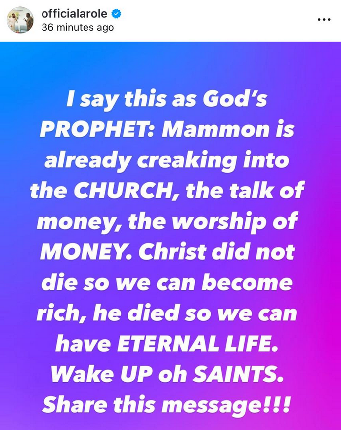 “I say this as God’s PROPHET: Mammon is already creaking into the CHURCH, the talk of money, the worship of MONEY. Christ did not die so we can become rich, he died so we can have ETERNAL LIFE. Wake UP oh SAINTS. Share this message!!!”