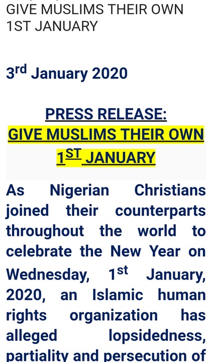 As Nigerian Christians joined their counterparts throughout the world to celebrate the New Year on Wednesday, 1st January, 2020, an Islamic human rights organization has alleged lopsidedness, partiality and persecution of Muslims in the manner the Nigerian government dishes out its holidays.