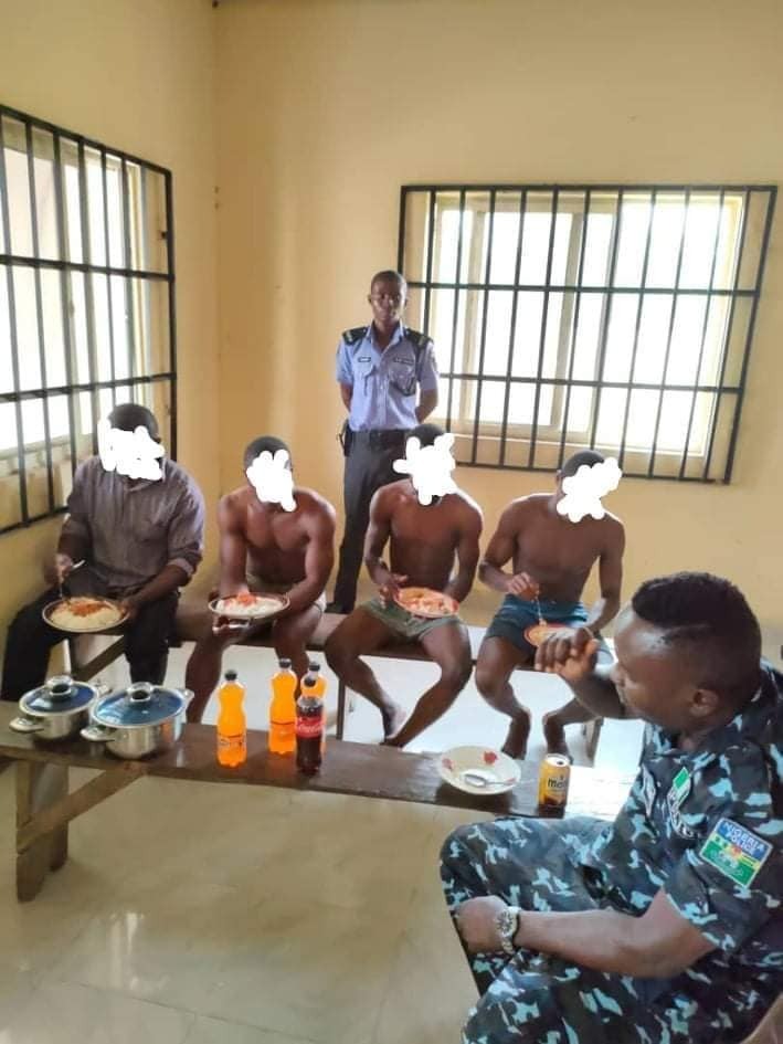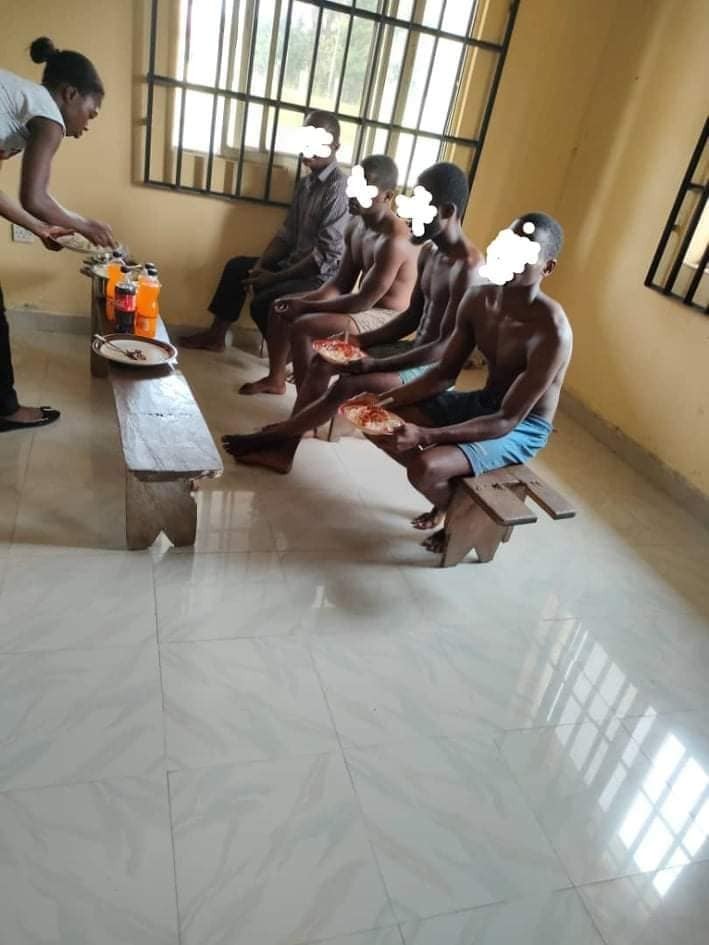 The meal, which included white rice and stew was served with soft drinks. While one of the suspects was fully clothed, the others were half-naked.