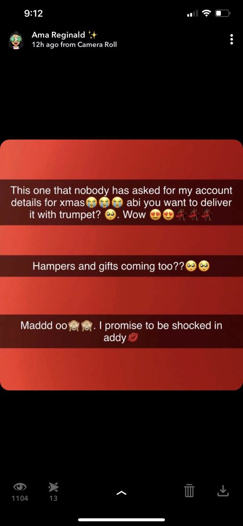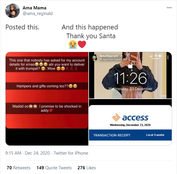 Posted this. And this happened Thank you Santa 😭❤️ pic.twitter.com/oSqYo4SbRB— Ama D’BiggURSTT (@ama_reginald) December 24, 2020
