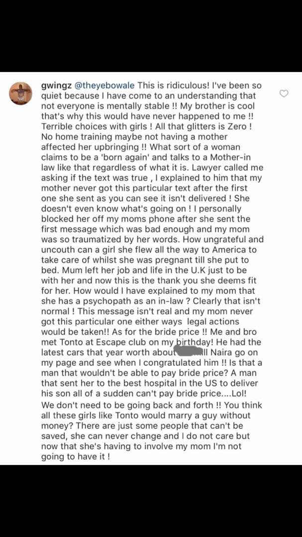 Following the lingering marriage crisis between Olakunle Churchill and his estranged wife Tonto Dikeh, which has seen exchanges of leaked text messages on social media reportedly sent to Churchill’s mother by Tonto and another another reportedly sent also by her mother -inlaw, Churchill’s brother Tokunbo (@gwingz) who is based in the UK has sadly reacted over the misleading frame up against his mother, as he alleged that she never sent the text message Tonto Dikeh claimed as she had been blocked after an earlier text.